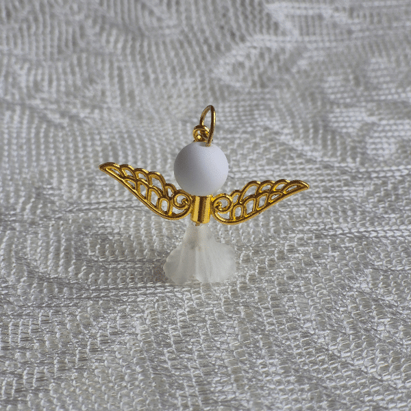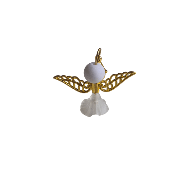 Ontdek dit prachtige handgemaakte geluksengeltje wit filigraan van Handmade By Dena. Dit lieve engeltje heeft prachtige gouden filigraan-vleugels die zacht glinsteren en een pure witte bol die symbool staat voor zuiverheid, licht en hoop. Onderaan zweeft een delicaat wolkje van een bloemkraal, waardoor het lijkt alsof het engeltje zachtjes zweeft. Het geheel hangt aan een stevig gouden ophanghaakje, klaar om als hanger, aan je sleutelbos, tas of ander plekje bij je te dragen.
