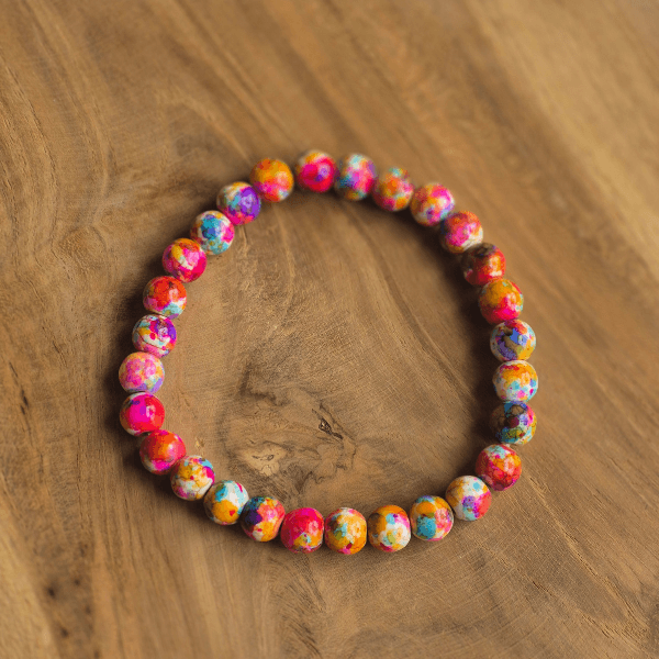 Met de hand geregen op elastisch koord zitten 8 mm keramiek kralen in een explosie van kleuren: spetterend roze, zonnig oranje, fris mint, diep paars, fel geel en nog veel meer. Elke kraal heeft een eigen abstract confetti-achtig patroon – geen twee armbanden zijn precies hetzelfde. Dat maakt ‘m extra speciaal.