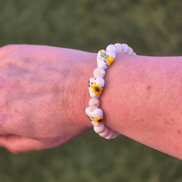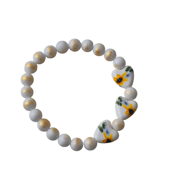 Materiaal: Elastiek, porseleinen hartjes met zonnebloem print, natuursteen Calciet